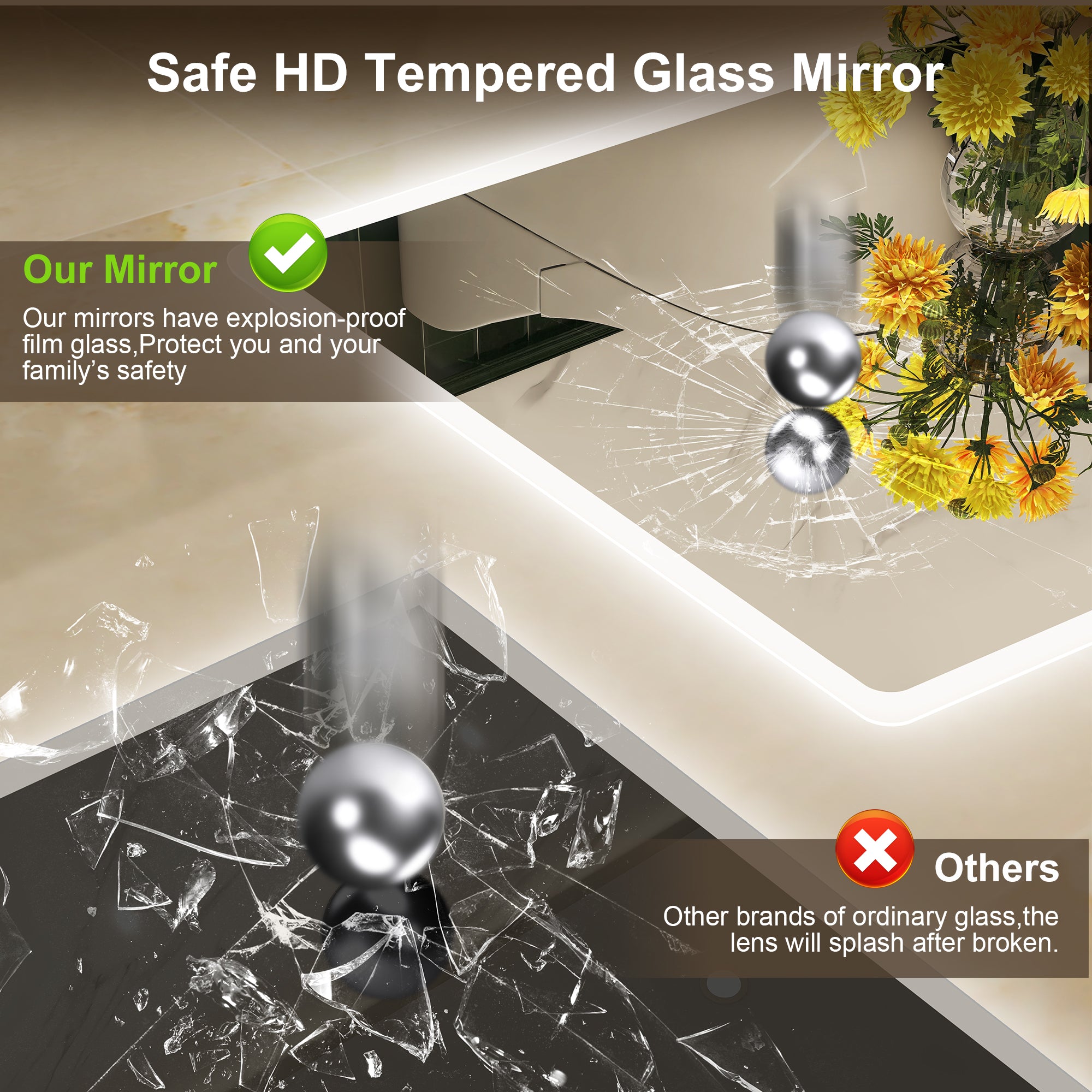 IP44 waterproof for mirror and IP65 waterproof for the LED strip ensure long-lasting performance and mitigate rust and corrosion. Made of 4mm tempered glass, it holds the parts together, even if accidentally broken, very safe.