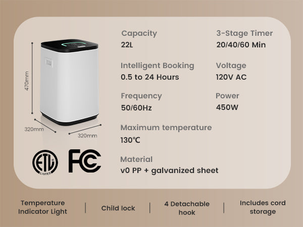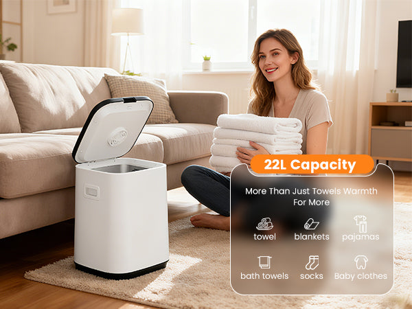 Large capacity: This bathroom large-capacity towel dryer has a capacity of 22 L, which can accommodate two oversized bath towels, bathrobes, blankets, pajamas, etc. Additionally, it can hold approximately 5 medium-sized bath towels. The 4 internal wall-mounted hooks facilitate the placement and retrieval of items.
