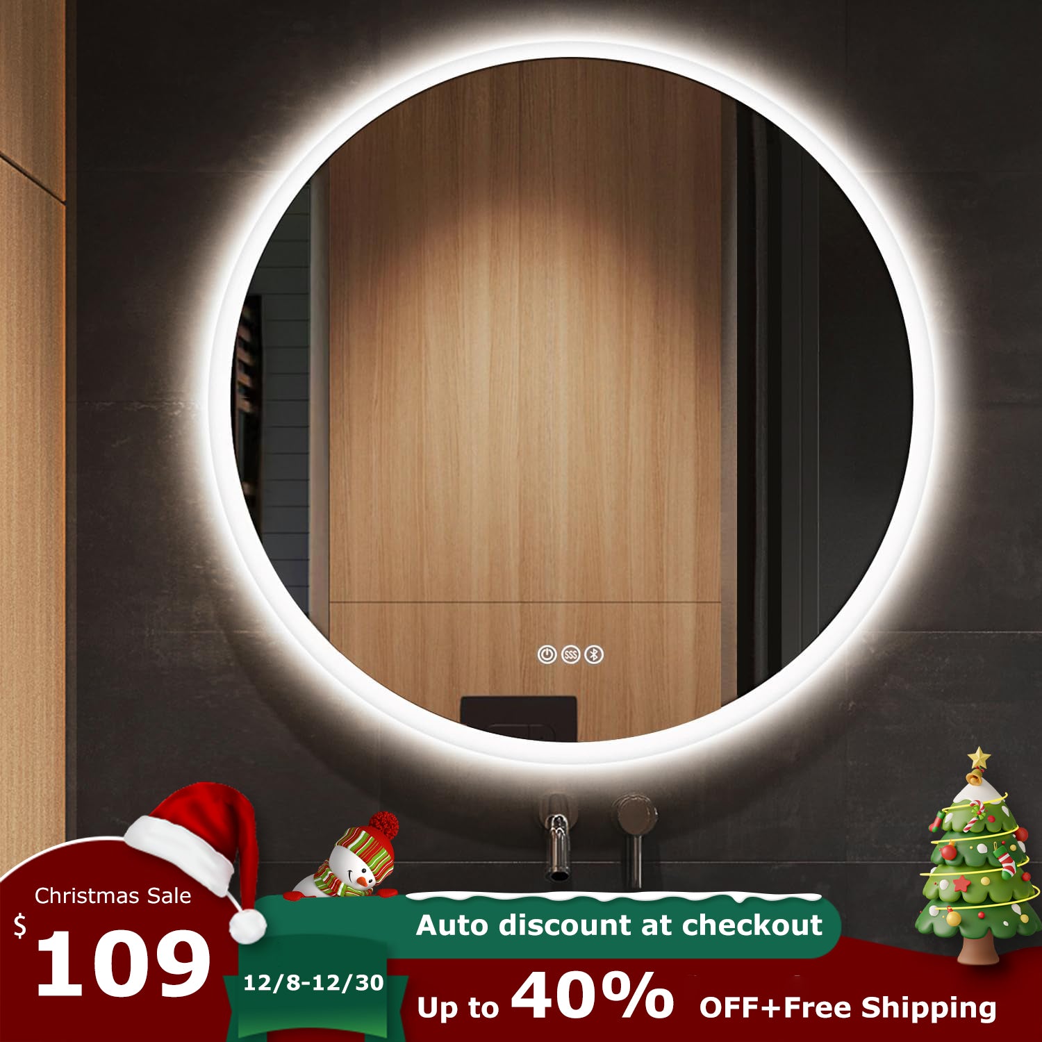 S'BAGNO 24 Inch Round LED Bathroom Mirror, Backlit and Front Lighted, Anti-Fog Vanity Mirror Wall Mounted with Bluetooth